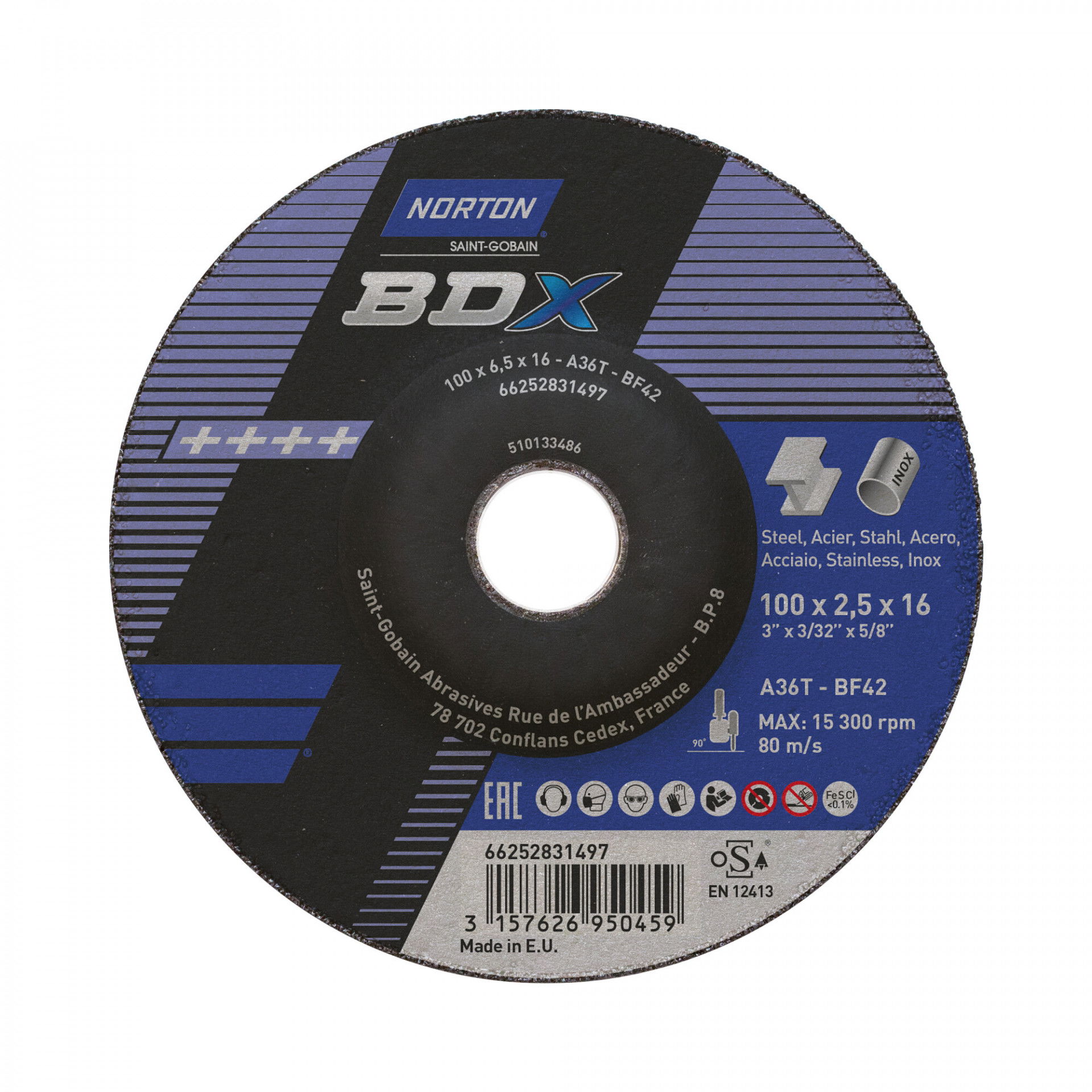 A Norton BDX fém-inox sorozat rendkívül vékony vágókorongokat kínál acél- és rozsdamentes acél széles választékához. A Norton BDX a költséghatékony vágókorongok szabványát állította be, amelyek hosszú élettartamot és gyorsabb fém eltávolítást biztosítanak az éles szilícium-karbid szemcséknek köszönhetően. Max.vágási sebesség : 80 m/s. Vas, kén és klór mentes. Nincs szennyeződés. Kevesebb rezgés.
