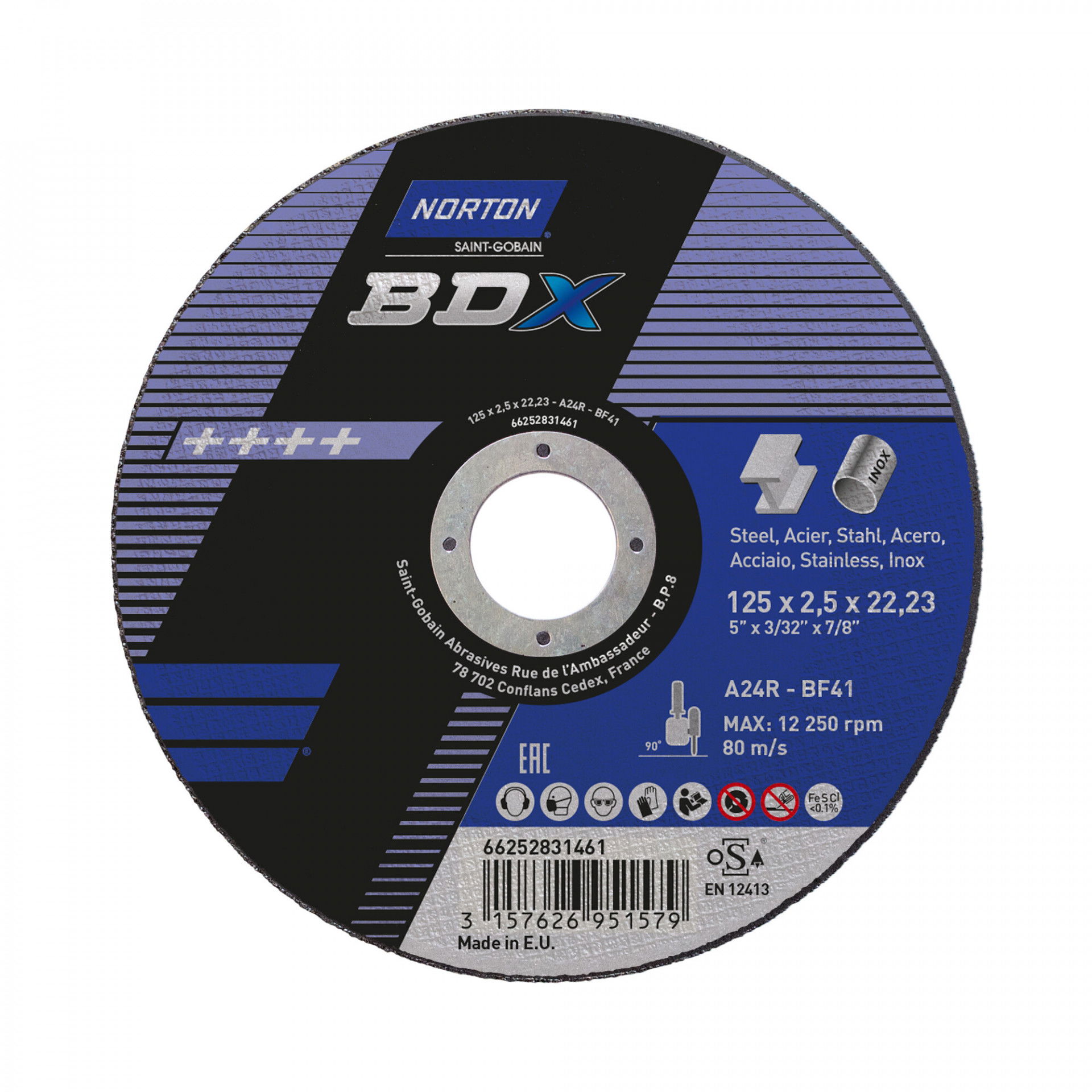 A Norton BDX fém-inox sorozat rendkívül vékony vágókorongokat kínál acél- és rozsdamentes acél széles választékához. A Norton BDX a költséghatékony vágókorongok szabványát állította be, amelyek hosszú élettartamot és gyorsabb fém eltávolítást biztosítanak az éles szilícium-karbid szemcséknek köszönhetően. Max.vágási sebesség : 80 m/s. Vas, kén és klór mentes. Nincs szennyeződés. Kevesebb rezgés.
