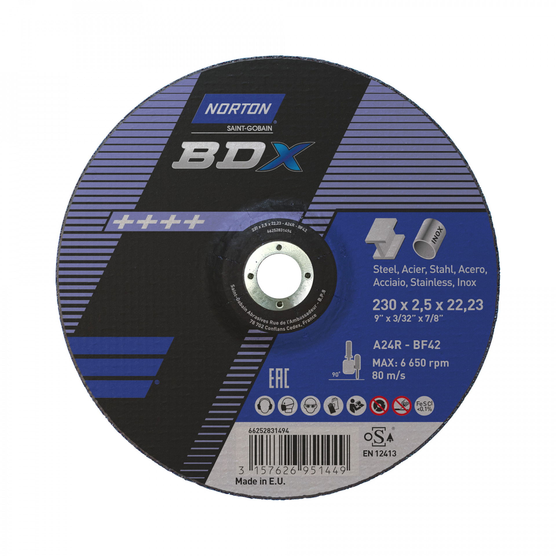 A Norton BDX fém-inox sorozat rendkívül vékony vágókorongokat kínál acél- és rozsdamentes acél széles választékához. A Norton BDX a költséghatékony vágókorongok szabványát állította be, amelyek hosszú élettartamot és gyorsabb fém eltávolítást biztosítanak az éles szilícium-karbid szemcséknek köszönhetően. Max.vágási sebesség : 80 m/s. Vas, kén és klór mentes. Nincs szennyeződés. Kevesebb rezgés.